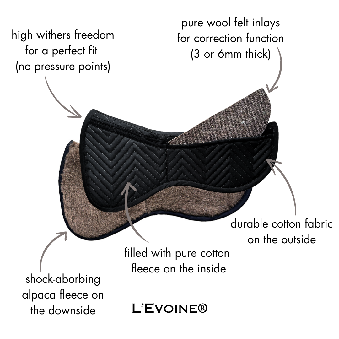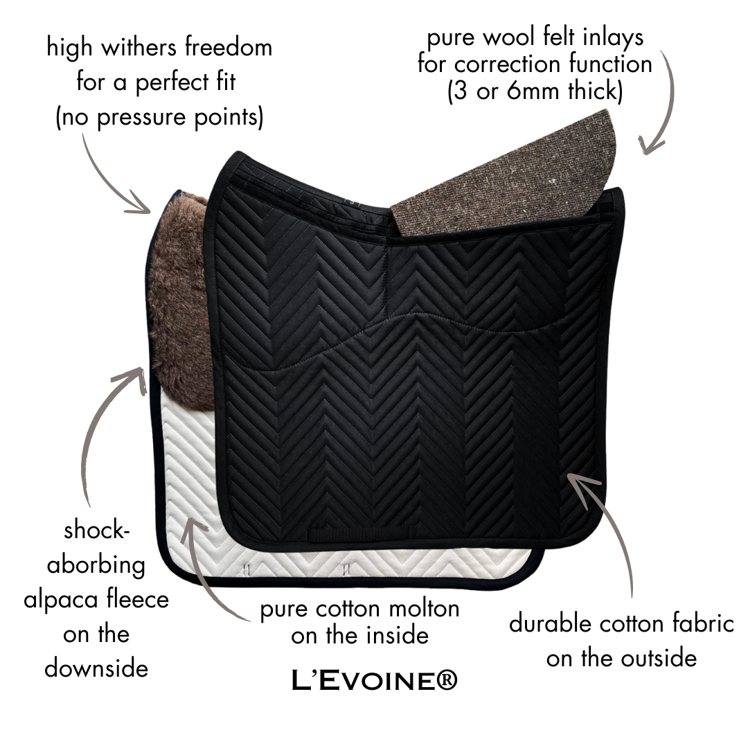 Das Korrekturpad hat eine Rückenlänge von 56,5cm. Die Korrektur Schabracke ist (wie alle L'Evoine Schabracken) 57,5cm lang. Somit kann das Korrekturpad unsichtbar unter den L'Evoine Schabracken platziert werden (Kombination aus Pad und Baumwoll-Schabracke).