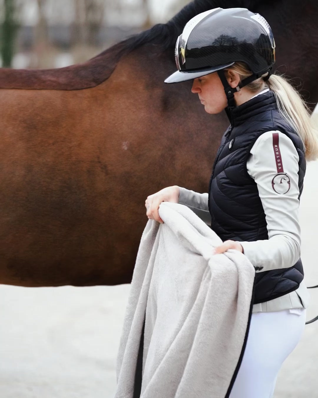 Baumwolle kann rund 60% ihres Eigengewichts an Feuchtigkeit aufnehmen und eignet sich daher hervorragend als Abschwitzdecke. Die Unterseite besteht aus saugfähigen Frottee-Schlingen und die Oberseite der Abschwitzdecke aus einem edlen, natürlich glänzenden Baumwoll-Samt.